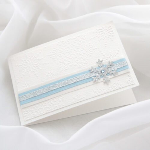 Punasest paberist suuremat sorti kinkekott valge glitterkartongist sädeleva lumehelbe ja pisikeste punaste sädelevate kivikestega.
